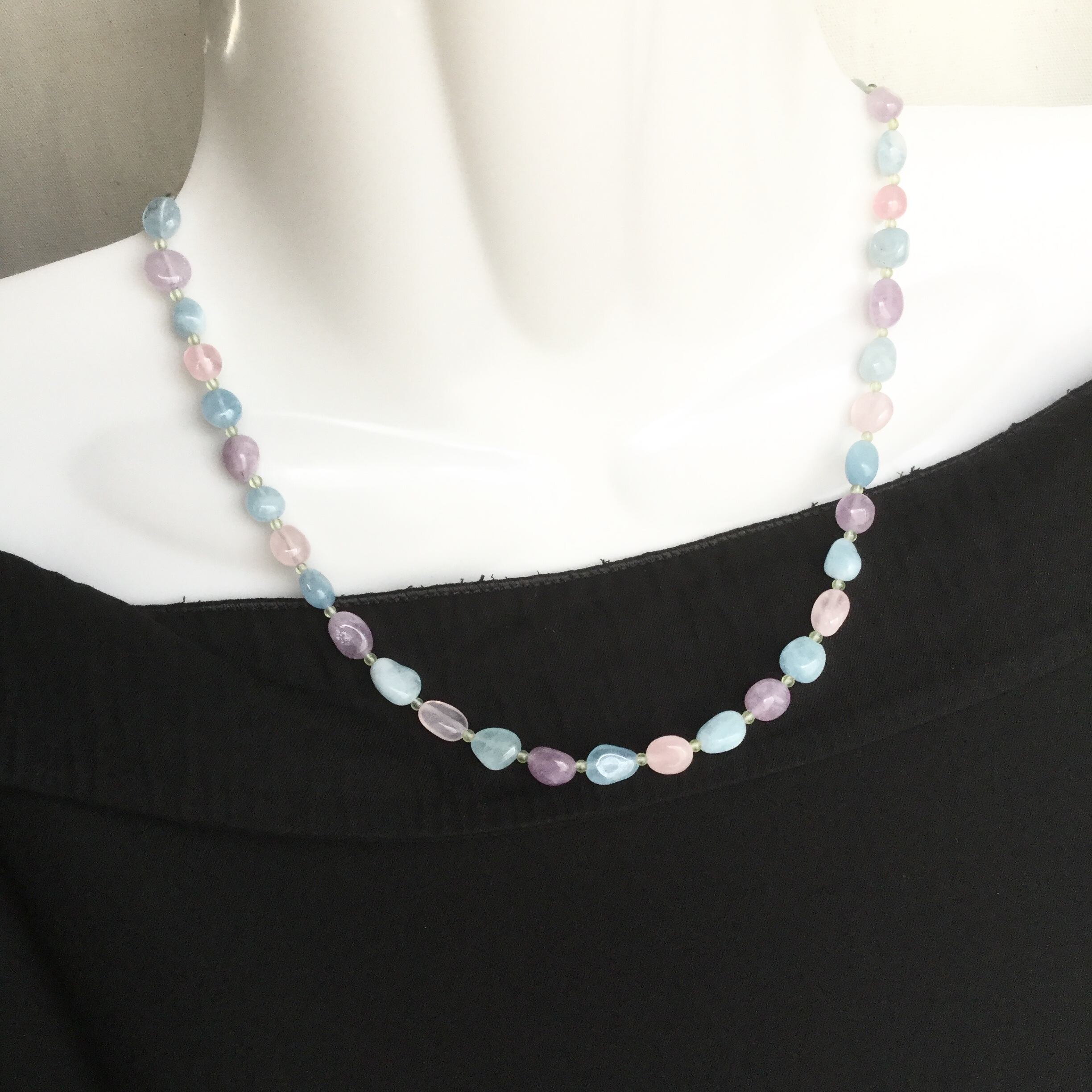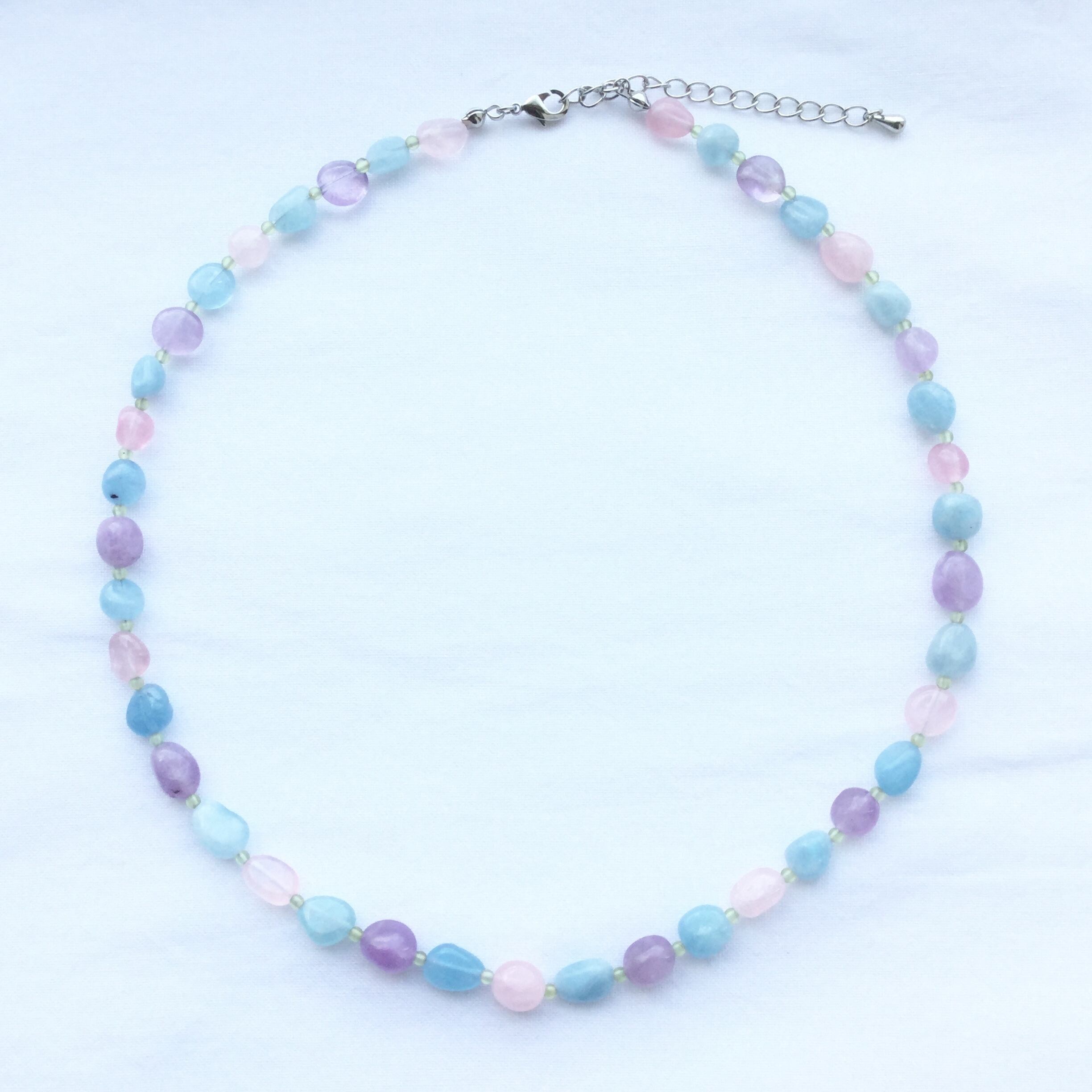 ローズクォーツ、ラベンダーアメジスト、アクアマリンの組み合わせ。