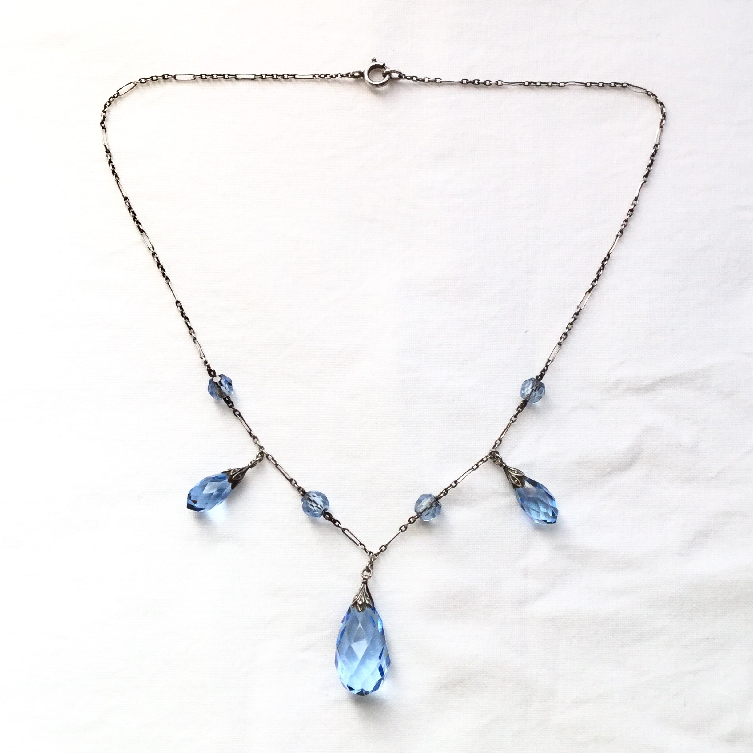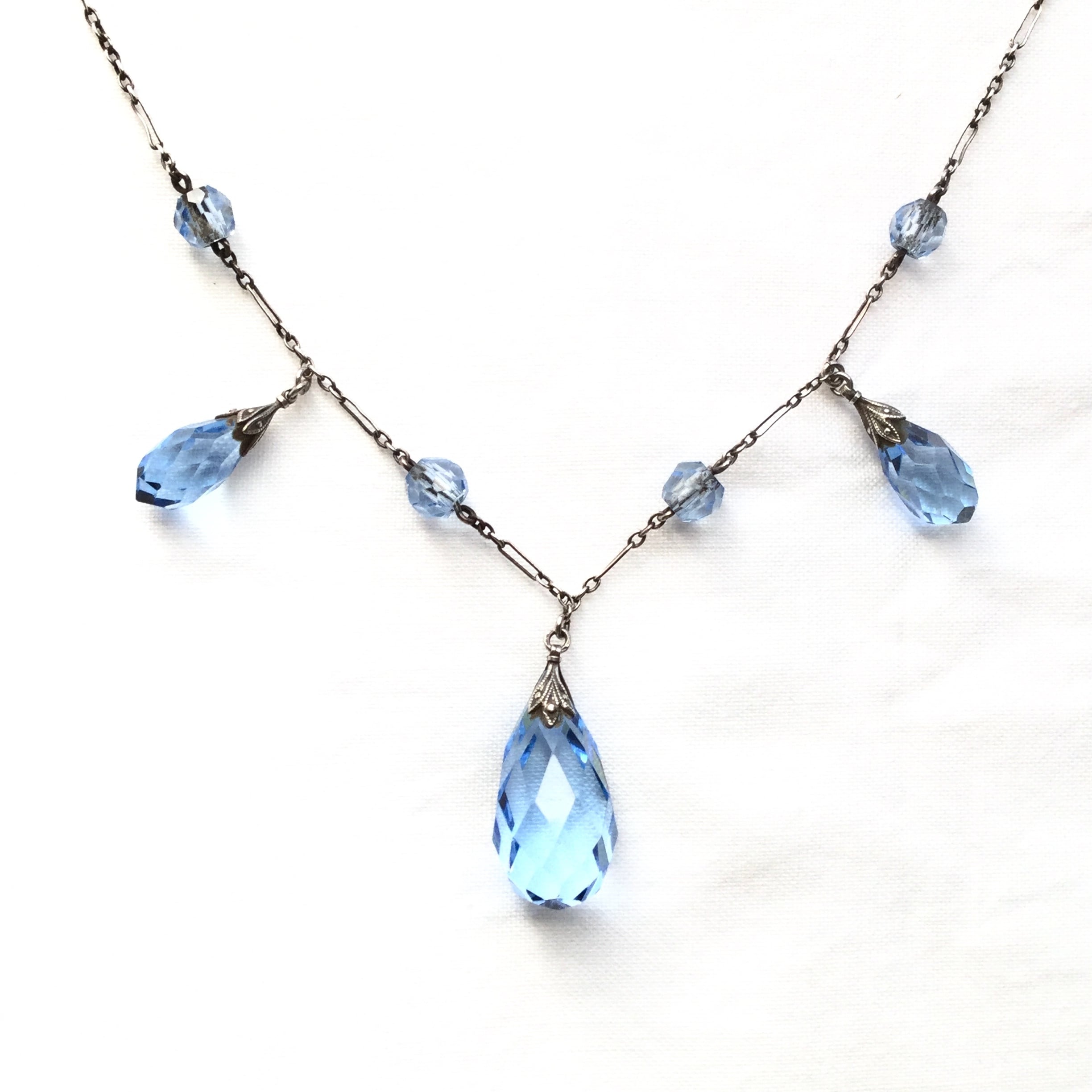 青く澄んだ輝きが美しいドロップカットとラウンドカットガラスのネックレス。