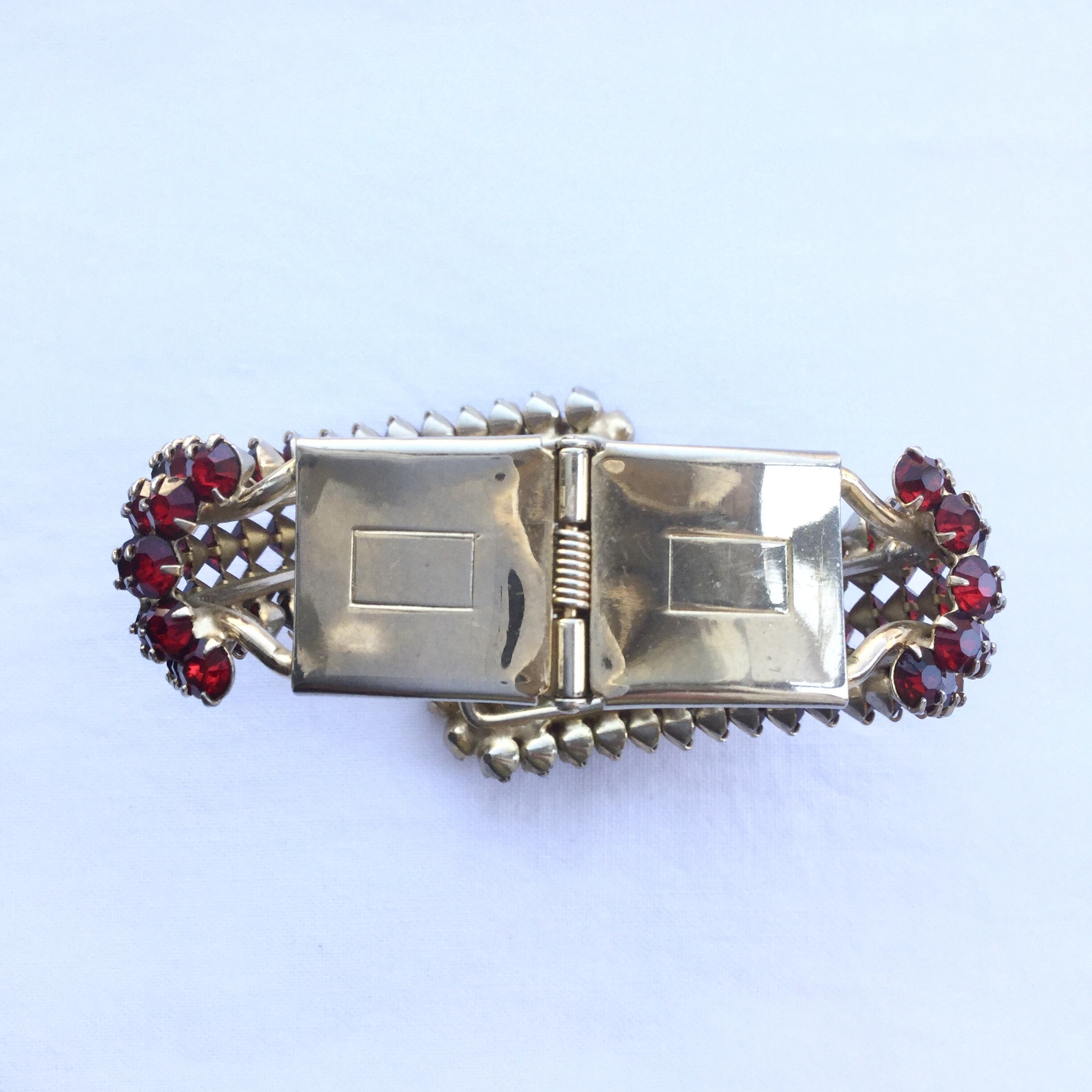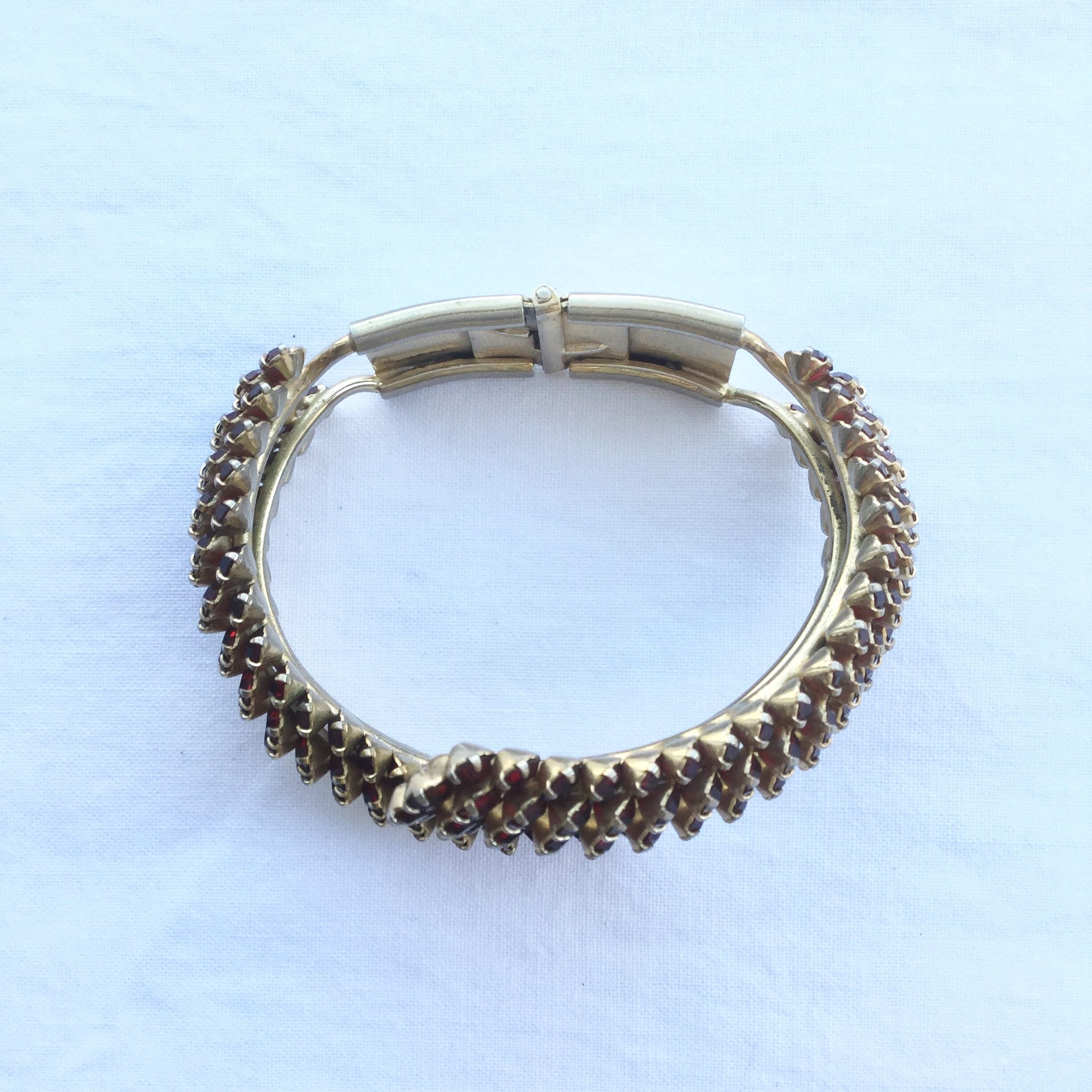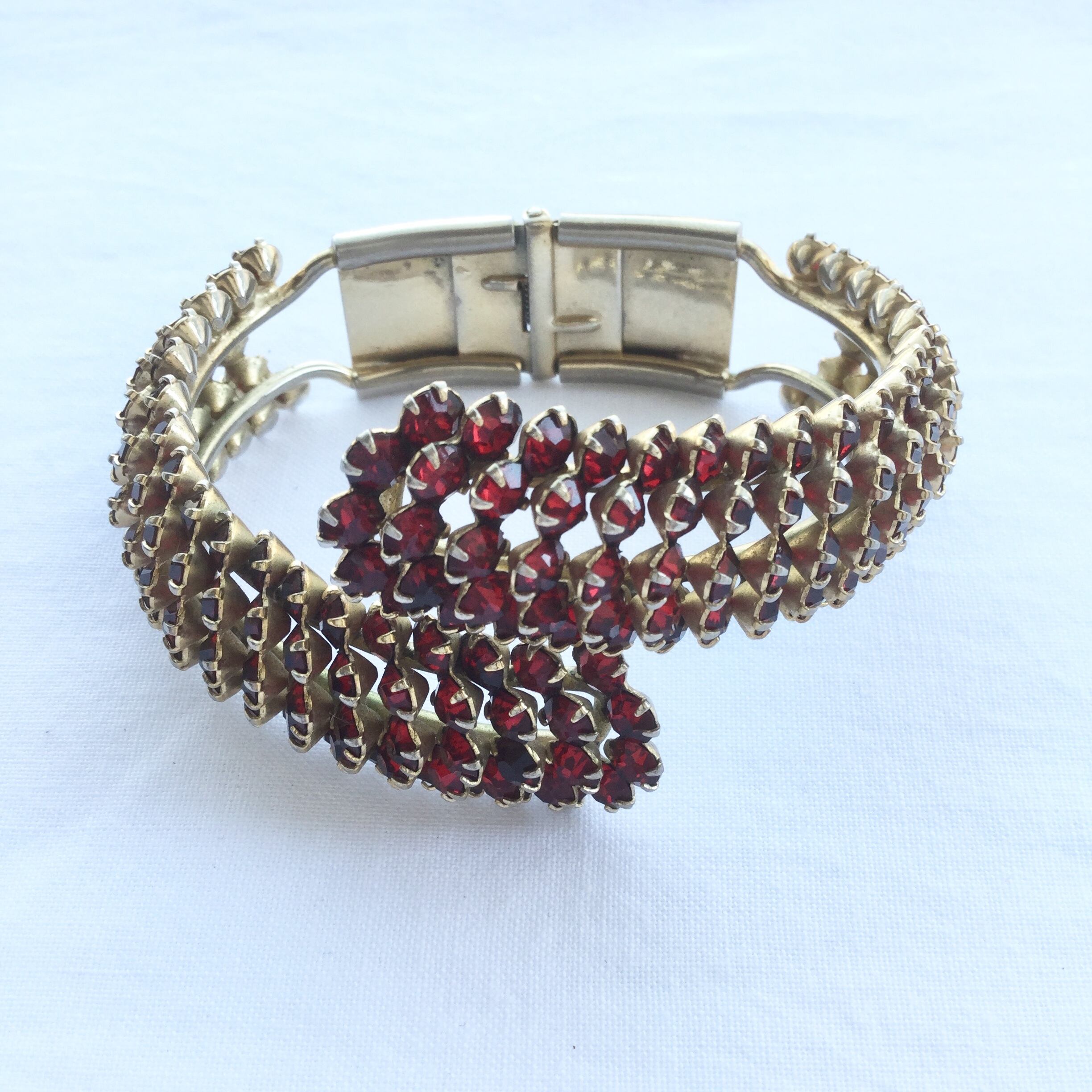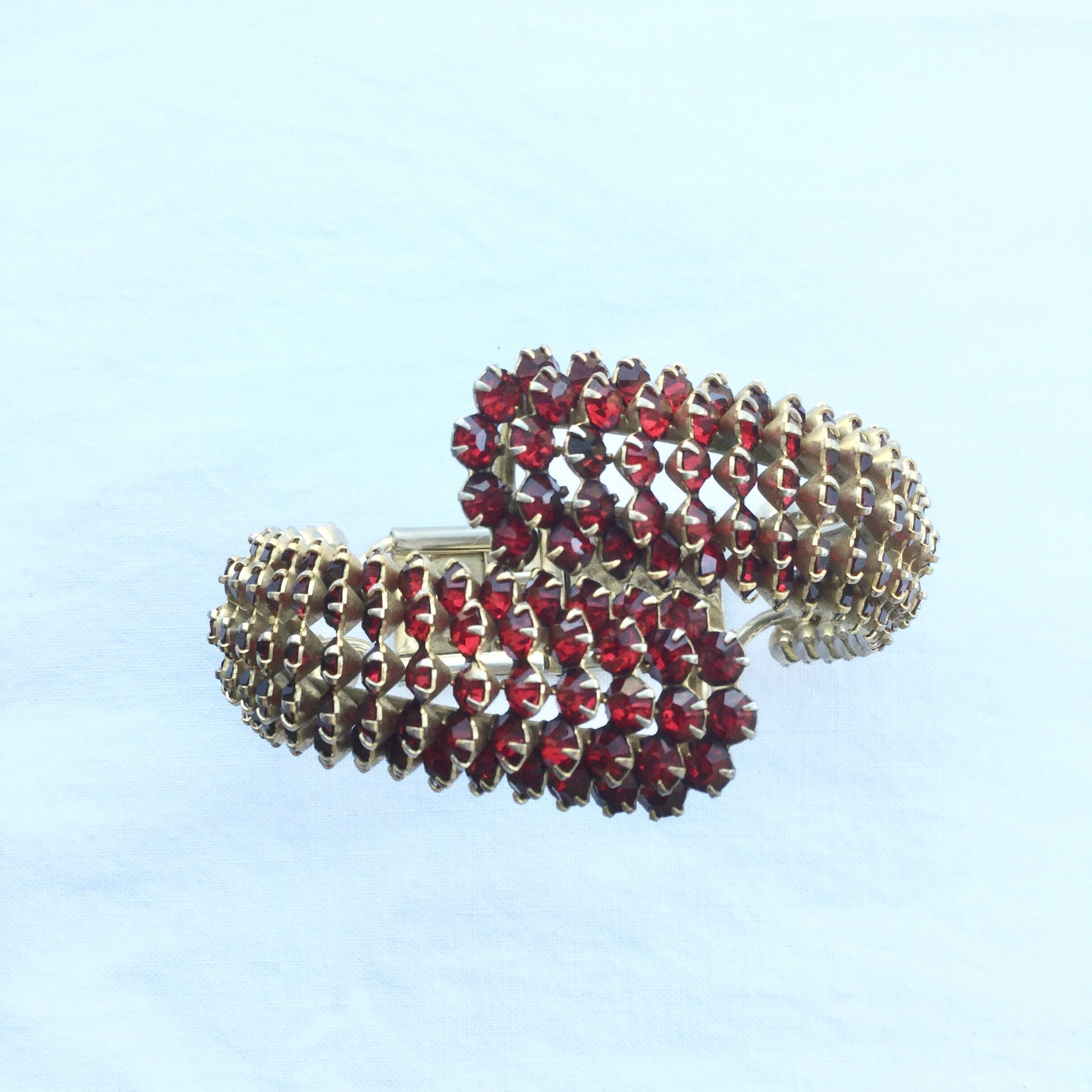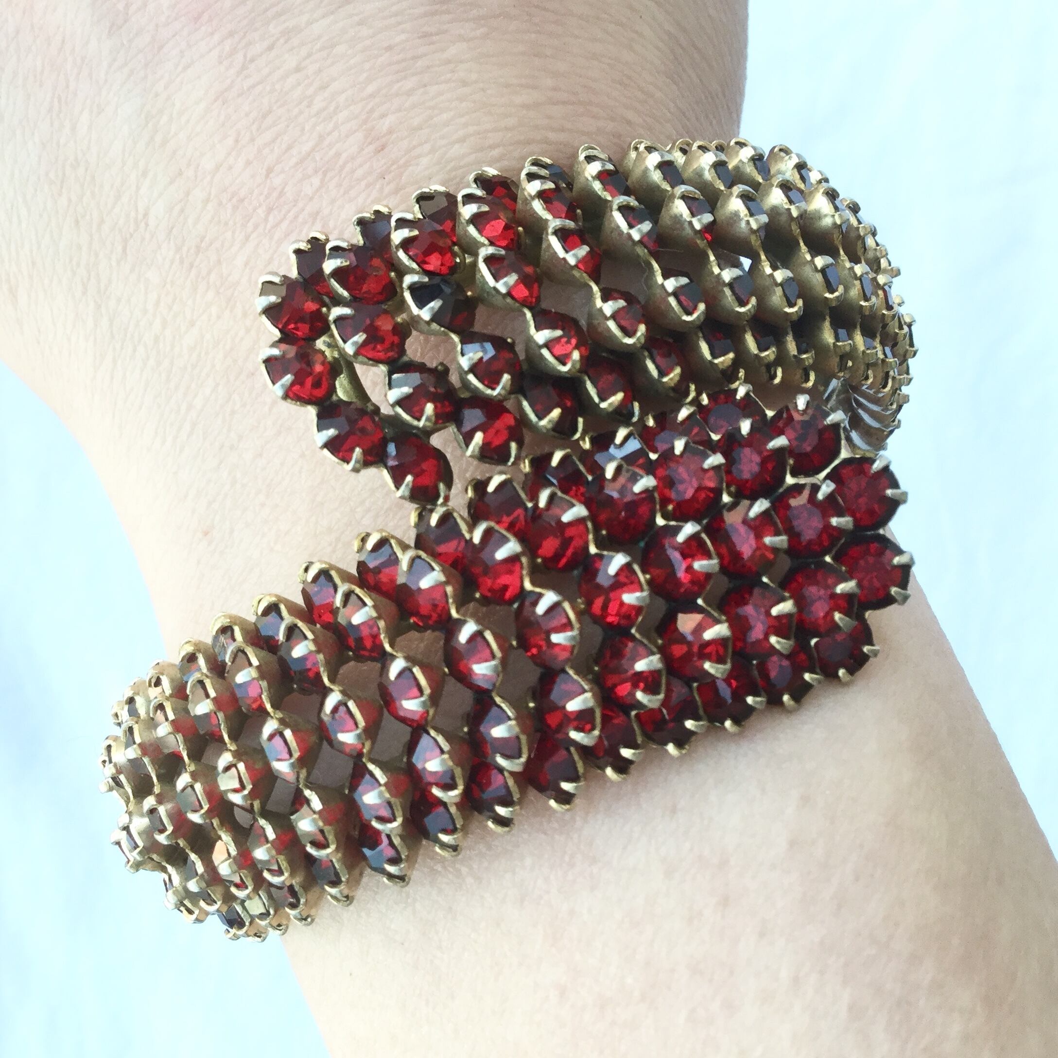 ガーネットかルビーを思わせる深紅のラインストーンがふんだんに使われた、シンプルながら大変華やかなブレスレット。