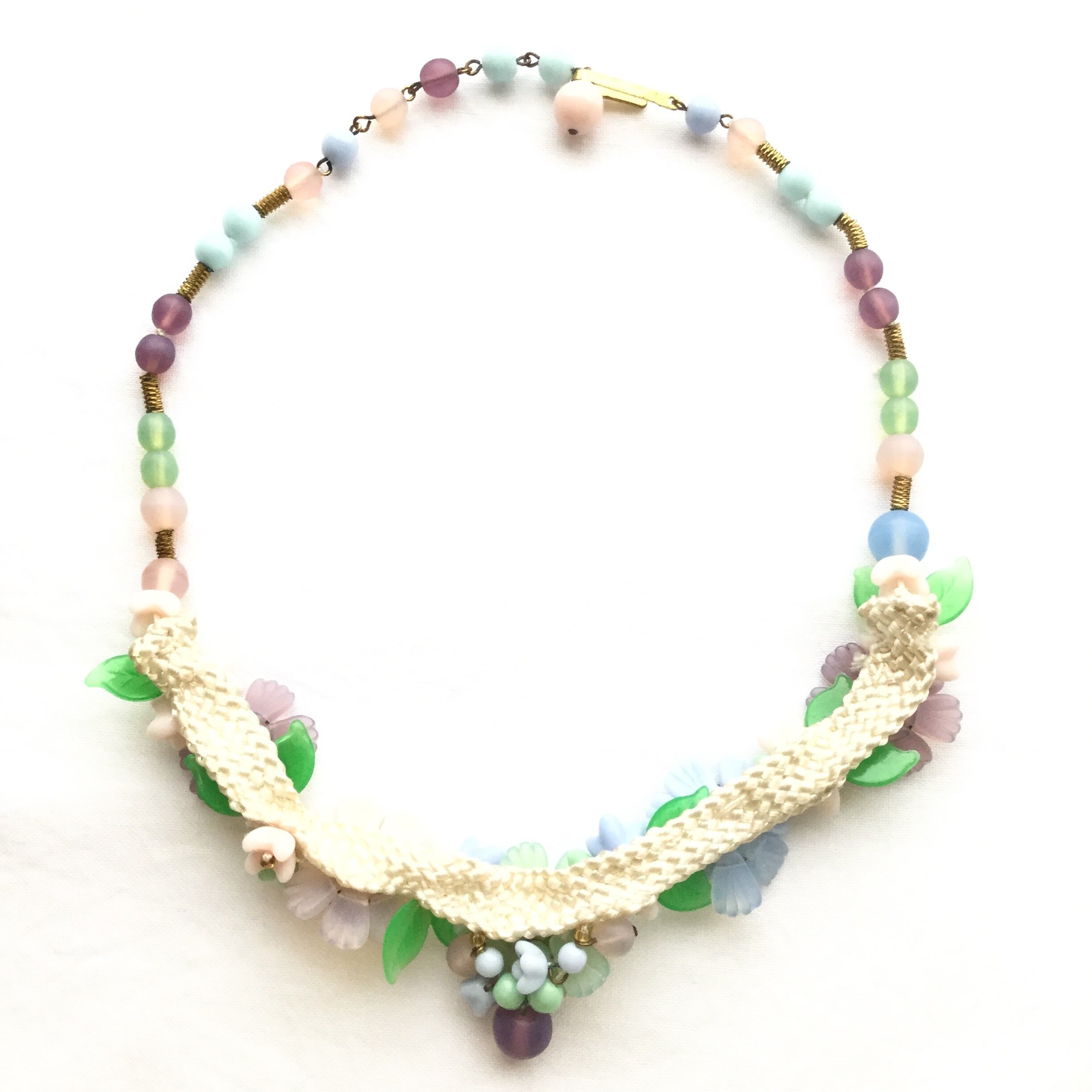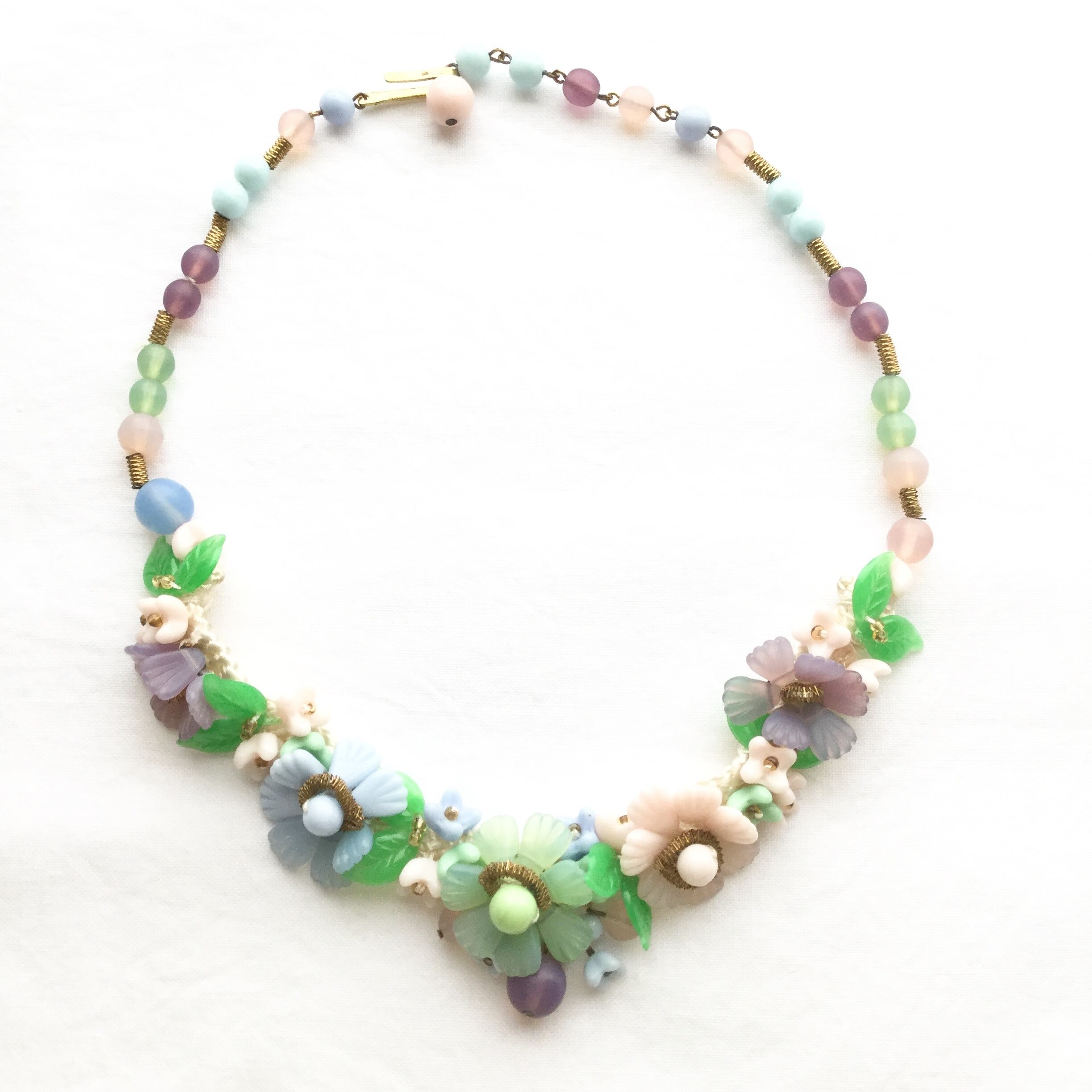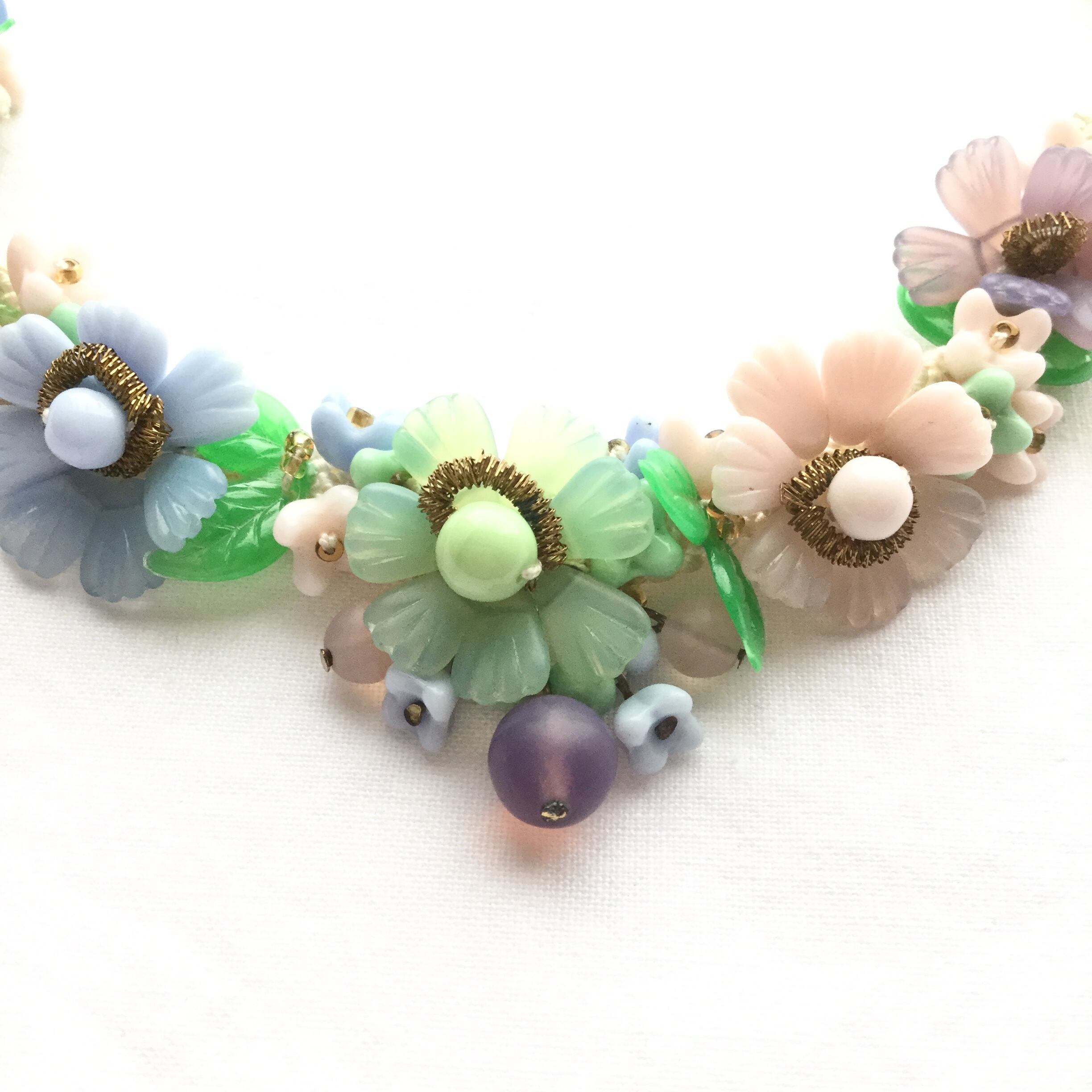 いかにもヴィンテージらしいレトロな可愛らしさにあふれた、アクリルビーズのお花いっぱいのネックレス。
