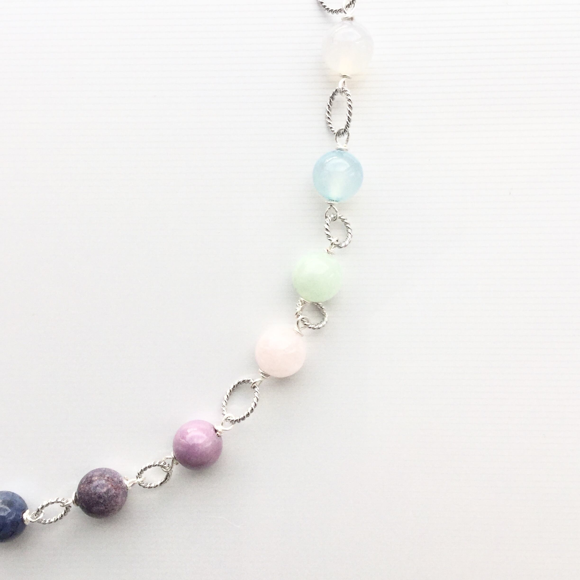 少し珍しいものも含め、8mmサイズの石を7種類揃えて、少し長めのネックレスを作ってみました。