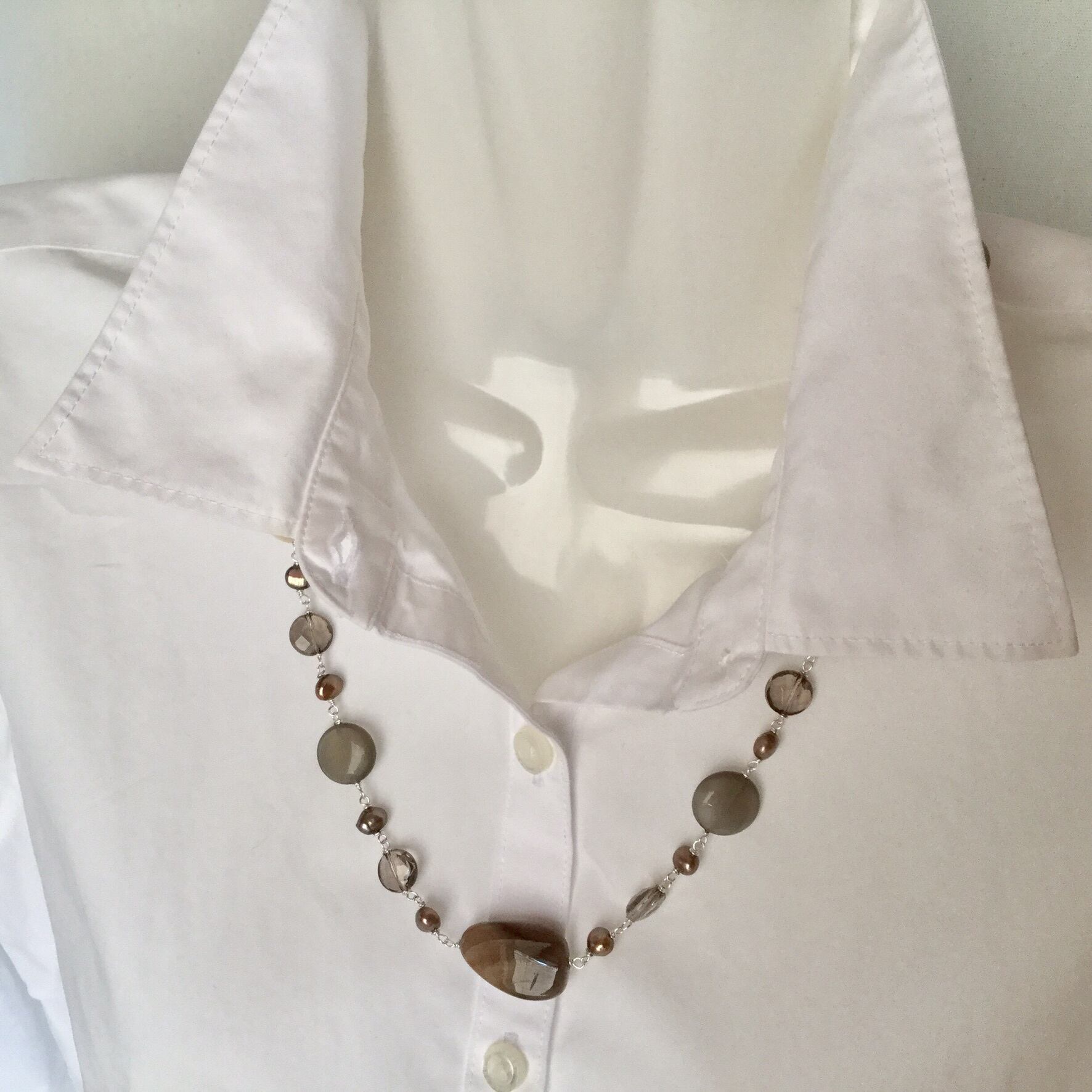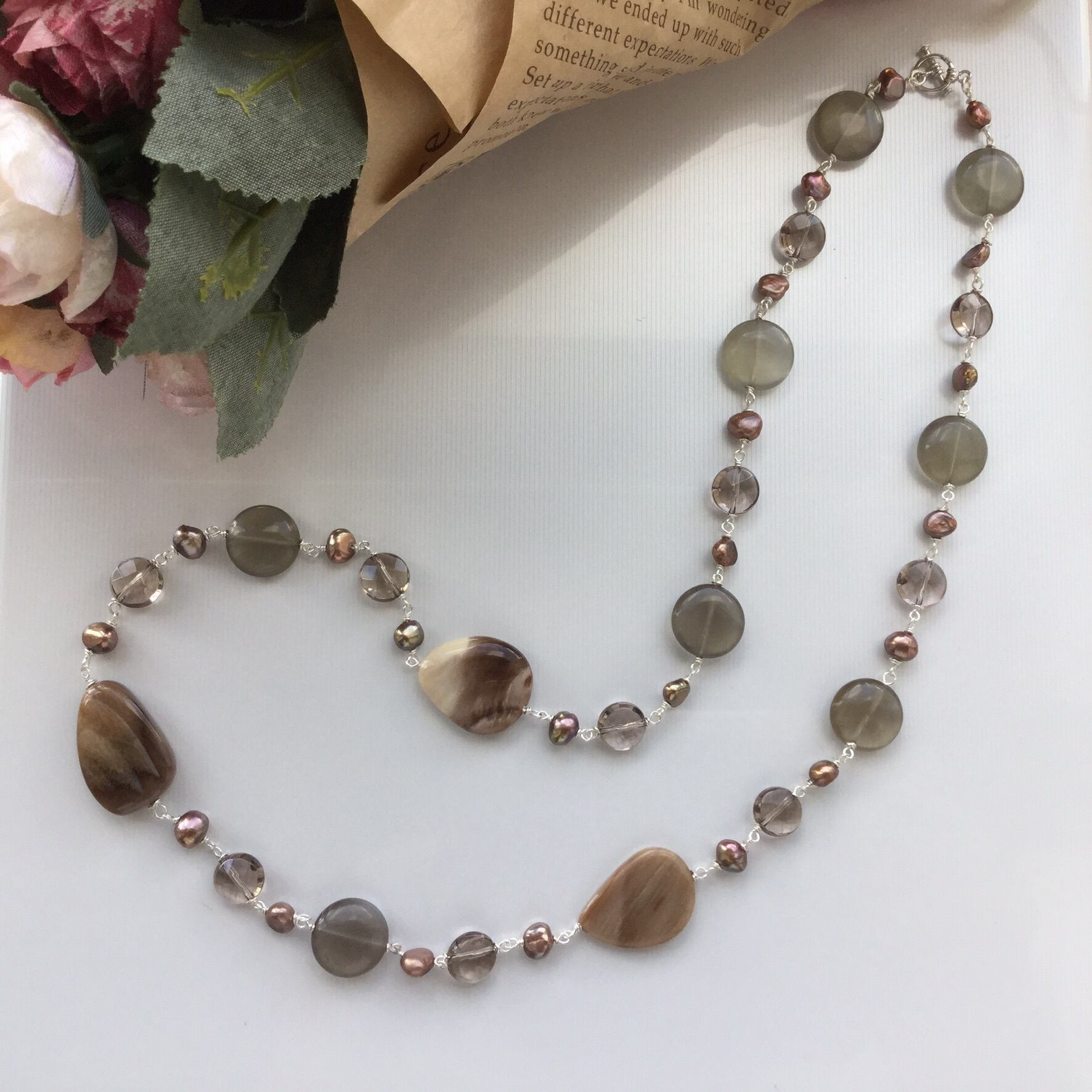 使用石:ペトリファイドウッド(フラットタンブル) 、グレーブラウンムーンストーン(コイン・15mm)、スモーキークォーツ(コインカット・10mm)、淡水真珠(バロック・約6〜8mm ※染色加工)