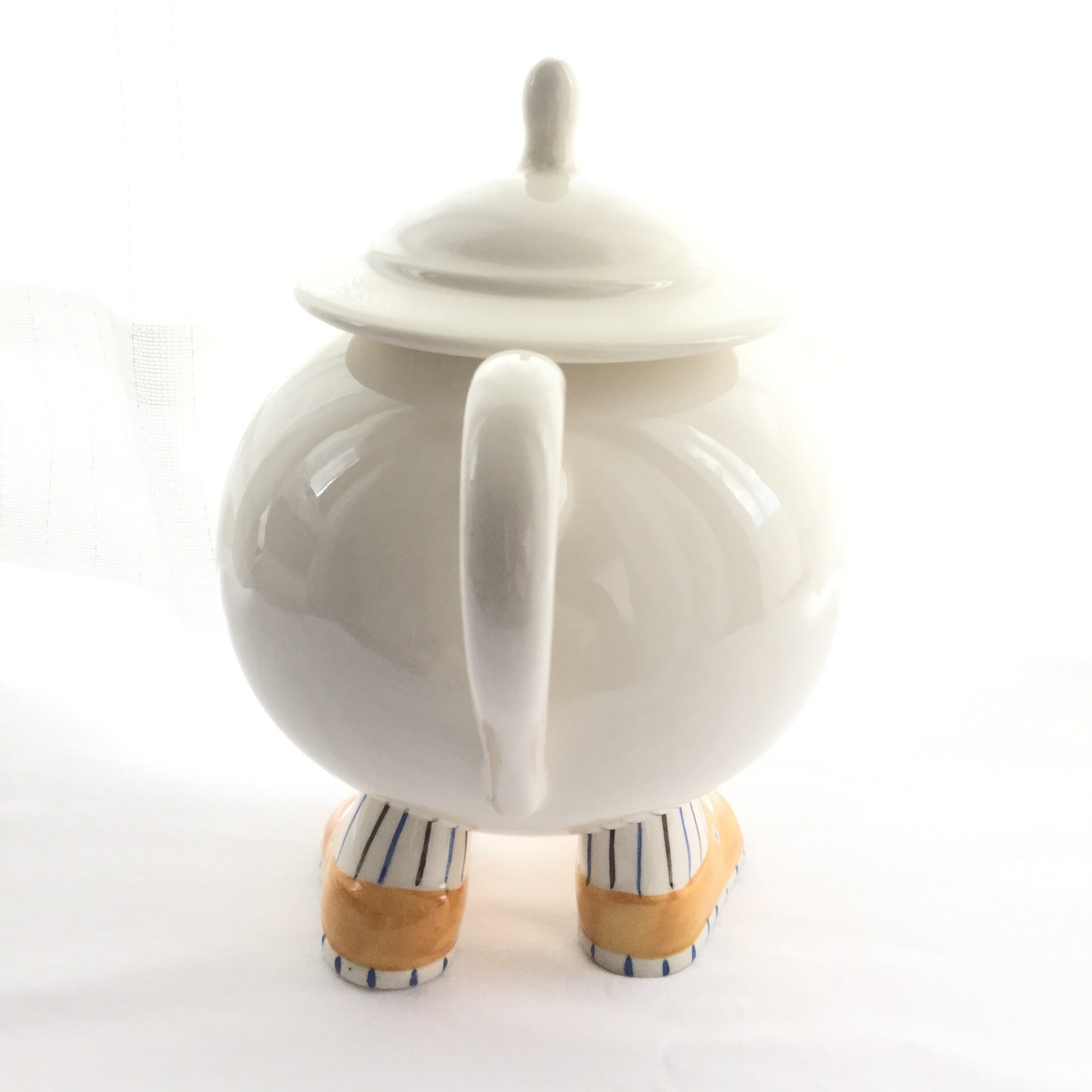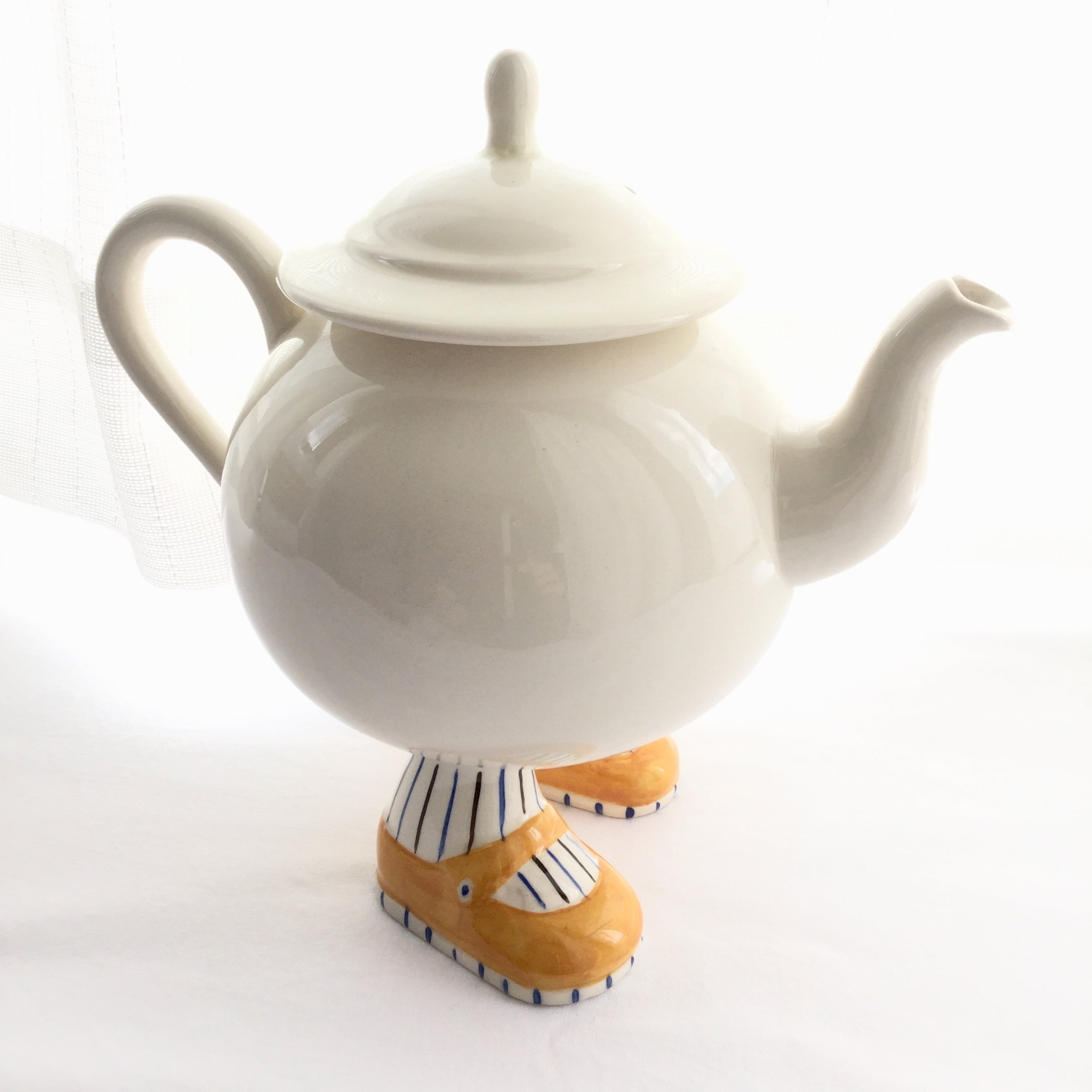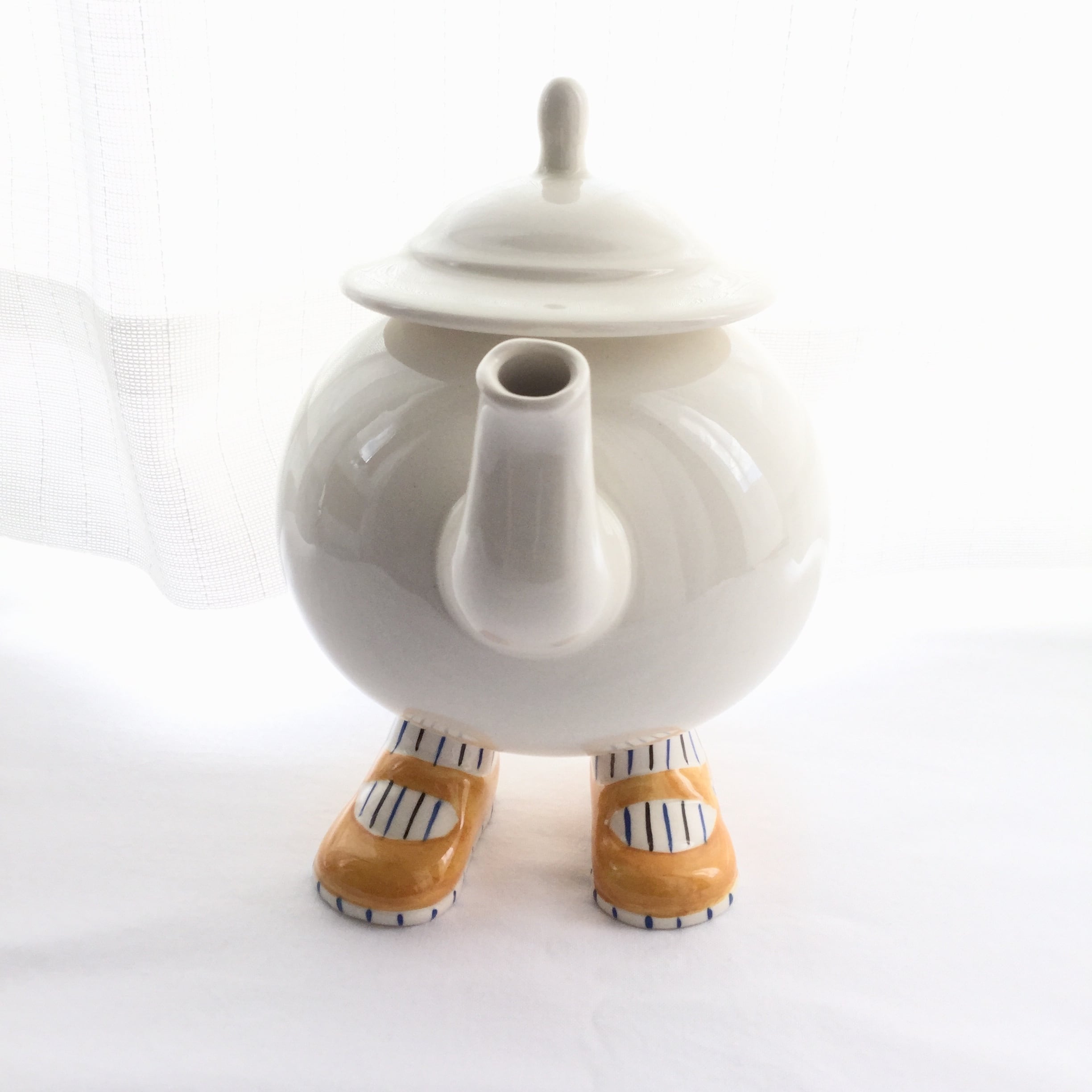 こちらは黄色い靴と青と黒のストライプの靴下、丸いお腹が可愛らしいポット。