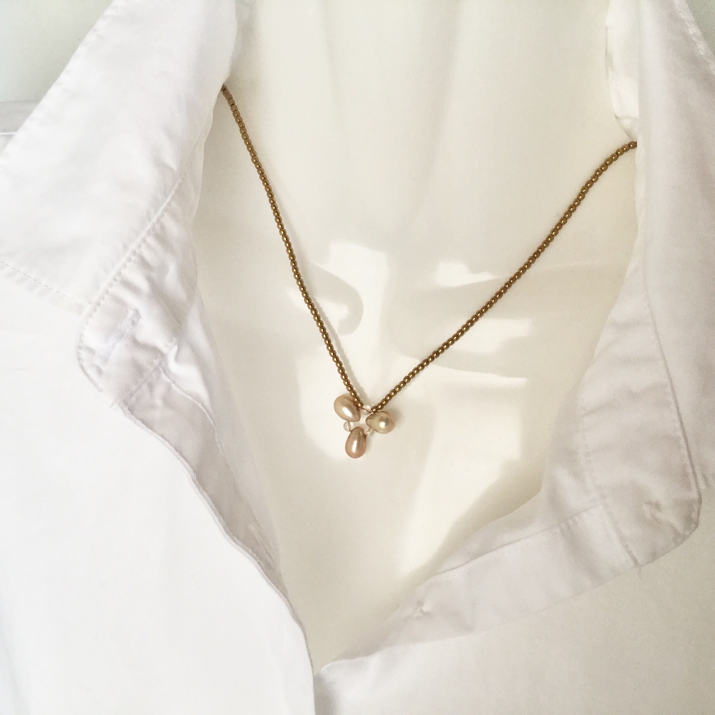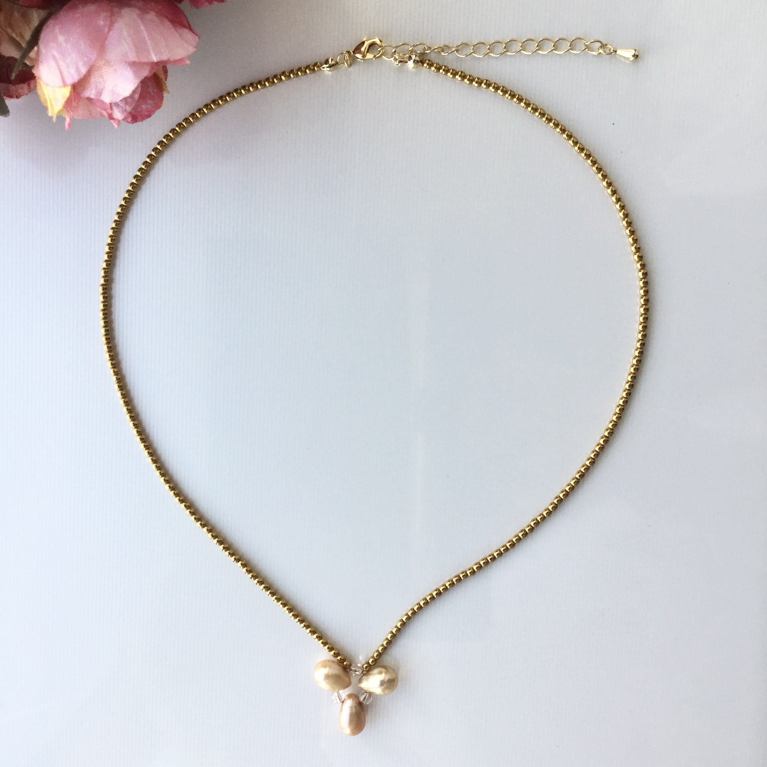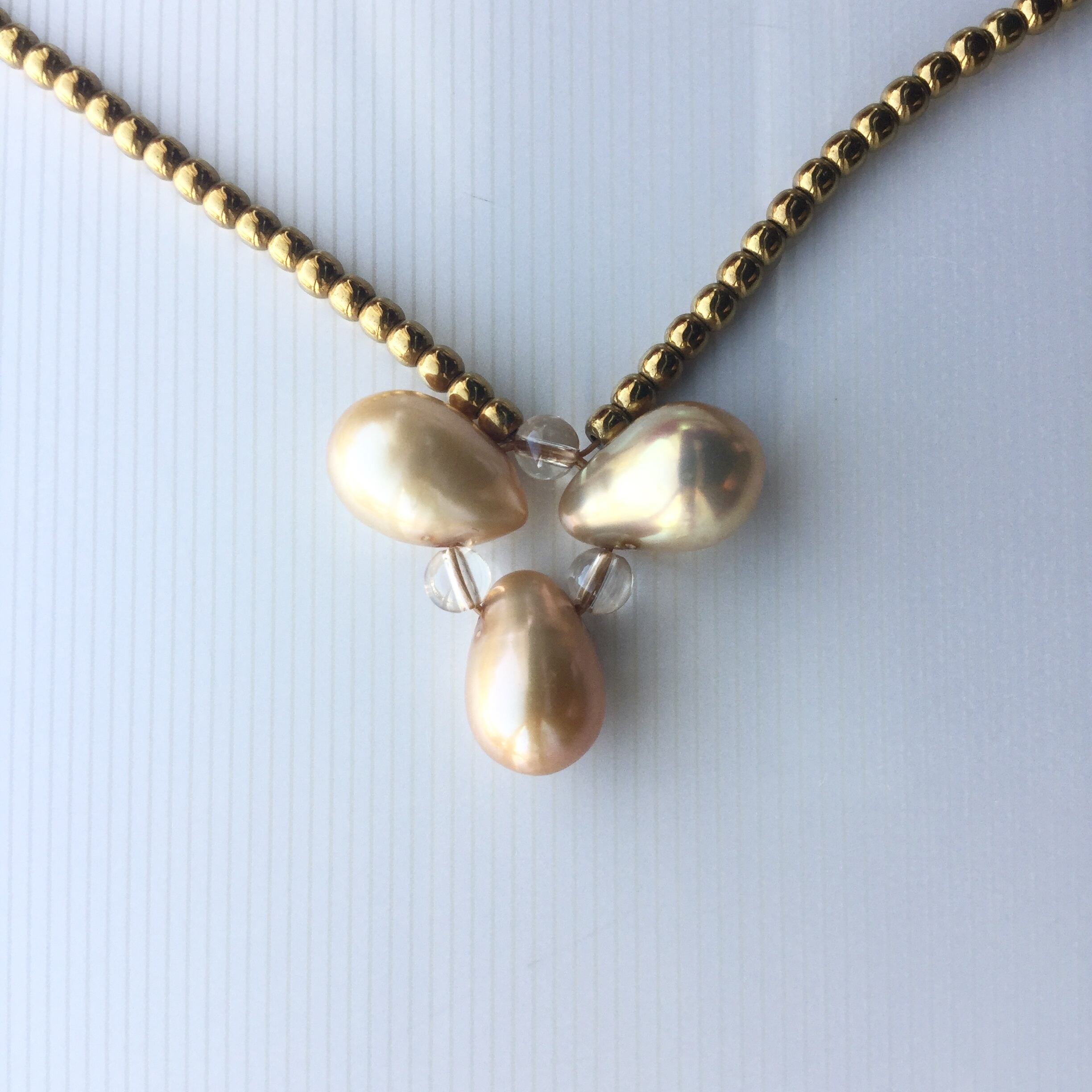ゴールドの淡水パールとシャンパンカラークォーツで作ったトップに、ゴールドカラーのヘマタイトで作ったチェーン。
