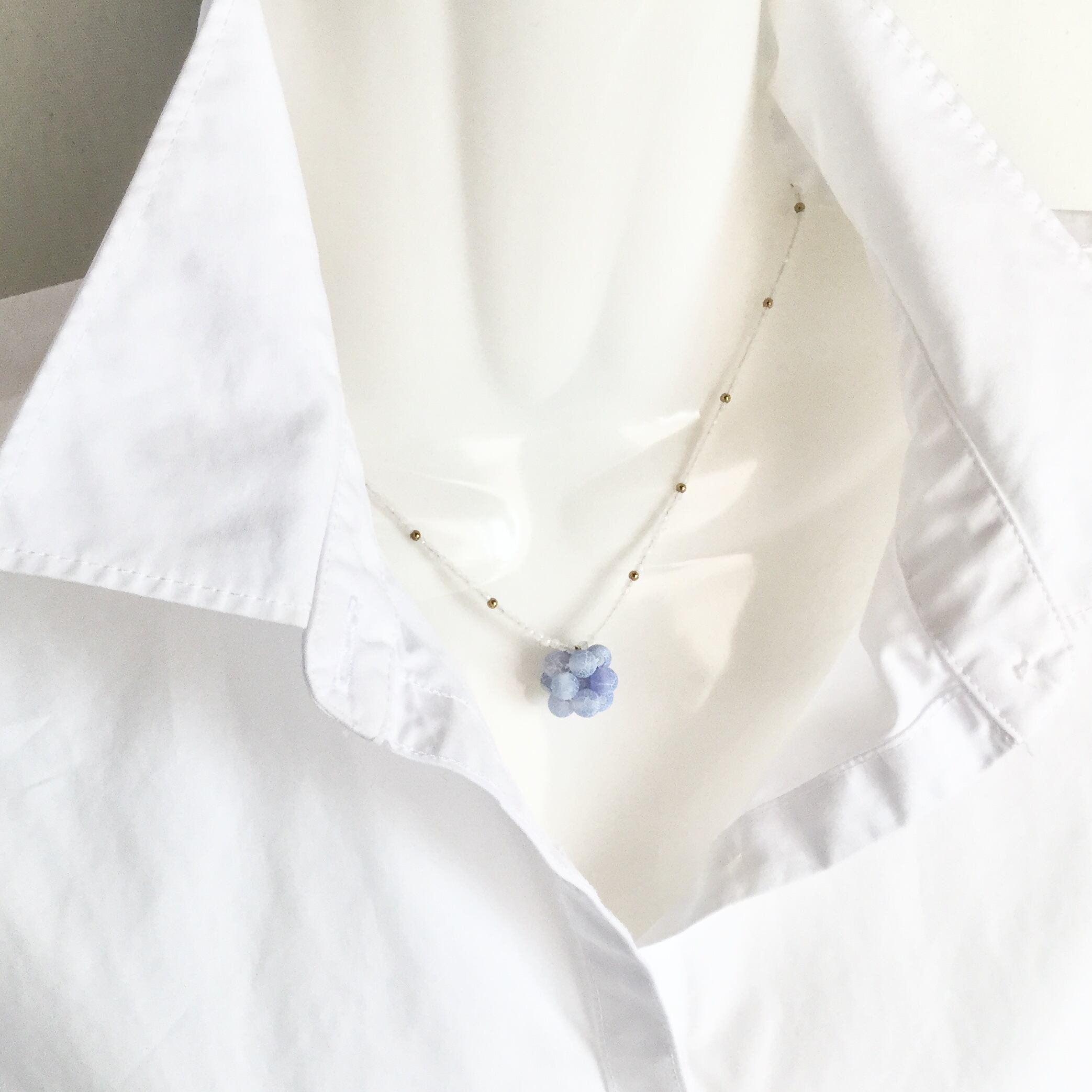 トップ部分はアンティーク風に加工されたフロストブルーカラーアゲート、チェーン部分は金色のヘマタイトをアクセントに、極小のホワイトジェード(ホワイトクォーツァイト)でできています。