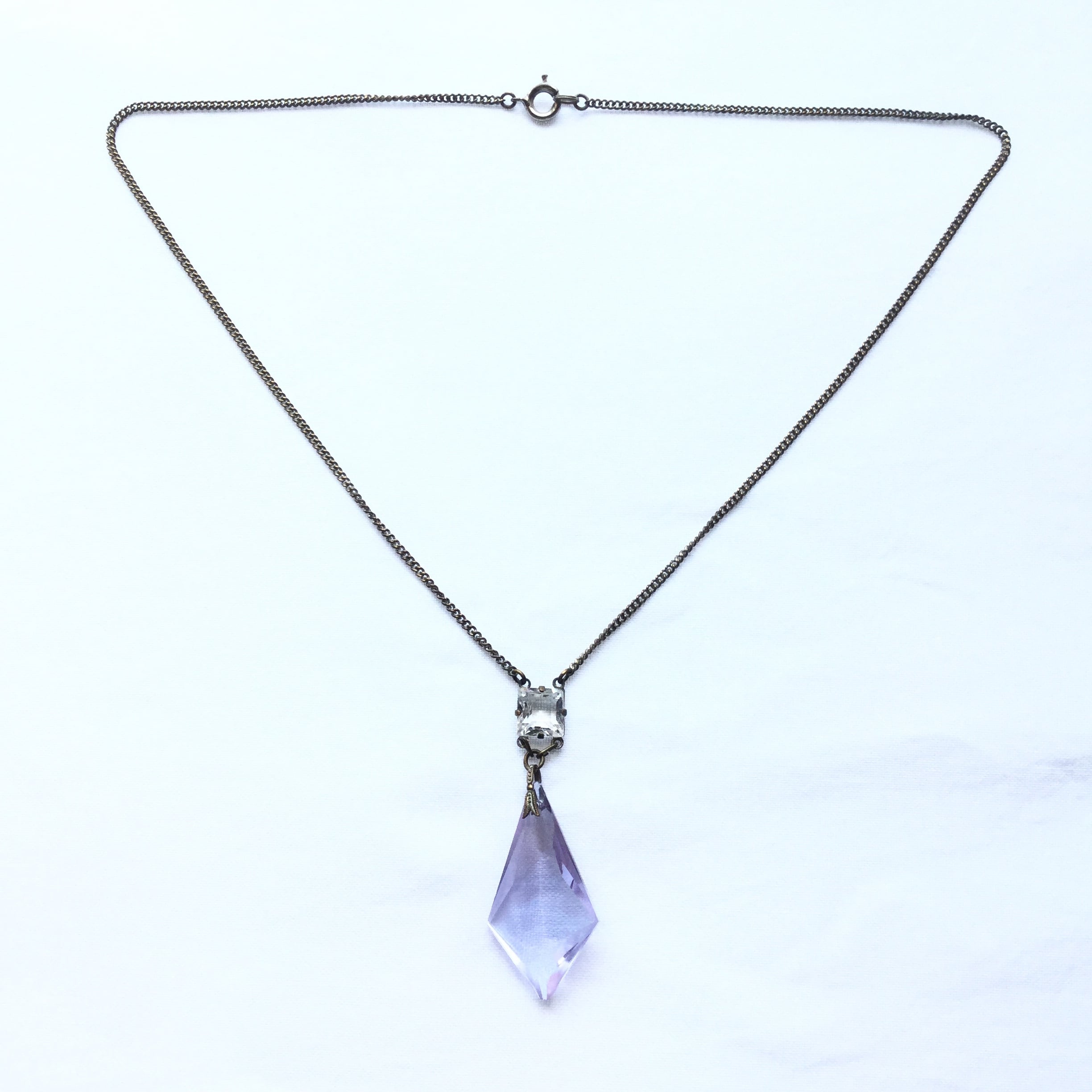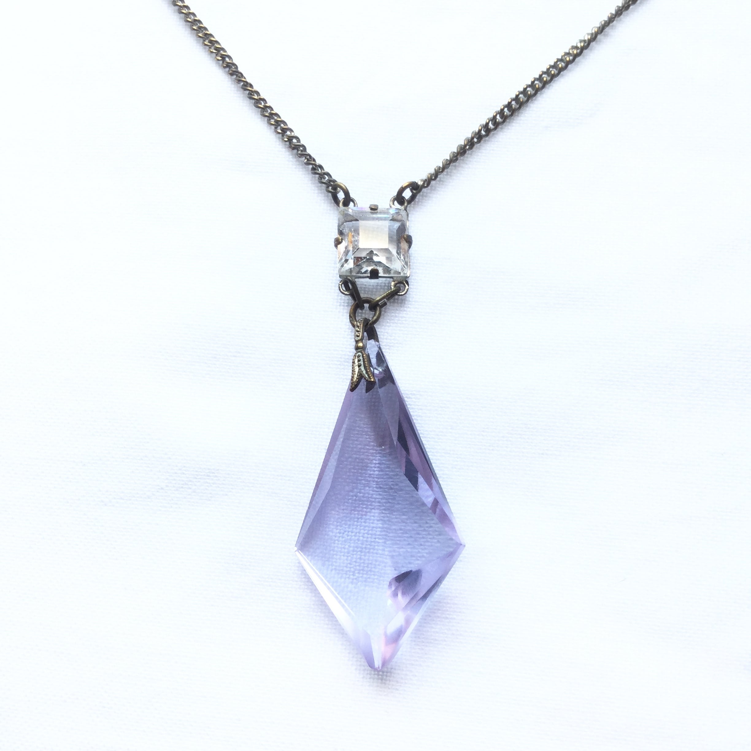 澄んだライラックブルーの大粒カットガラスに、オープンバックのスクエアカットガラス、シンプルなチェーンという、アール・デコらしいスタイルのネックレスです。