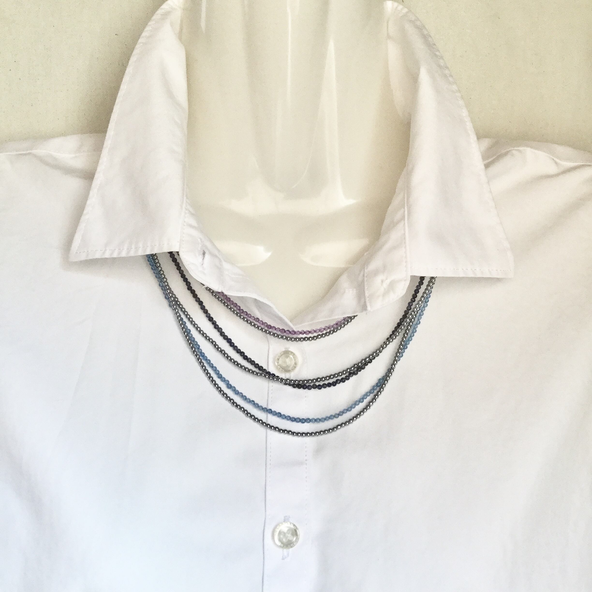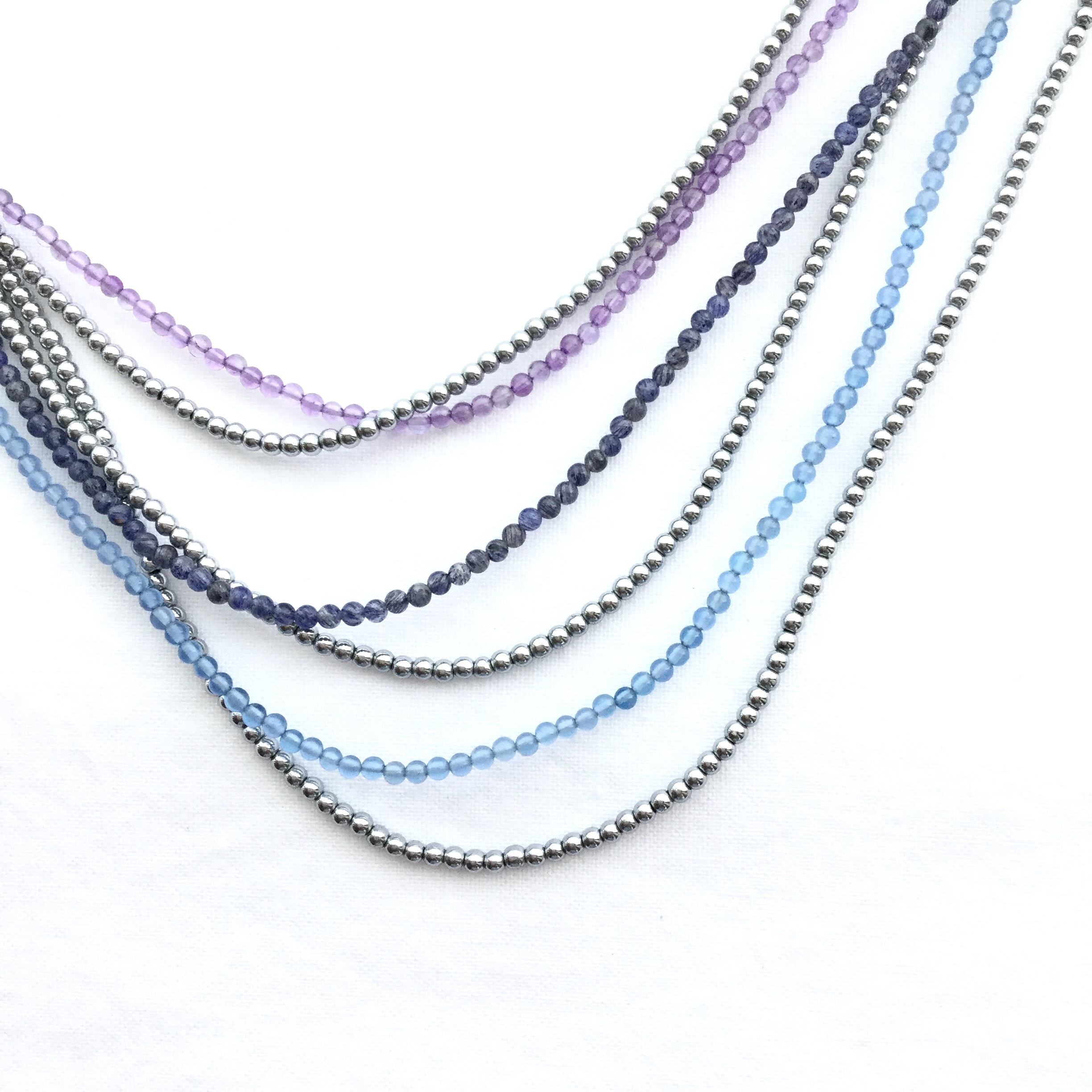 艶やかなアメジスト、深いブルーアベンチュリン、澄んだブルーアゲートという青系のグラデーションに、ヘマタイトのシルバーを重ねたネックレス。