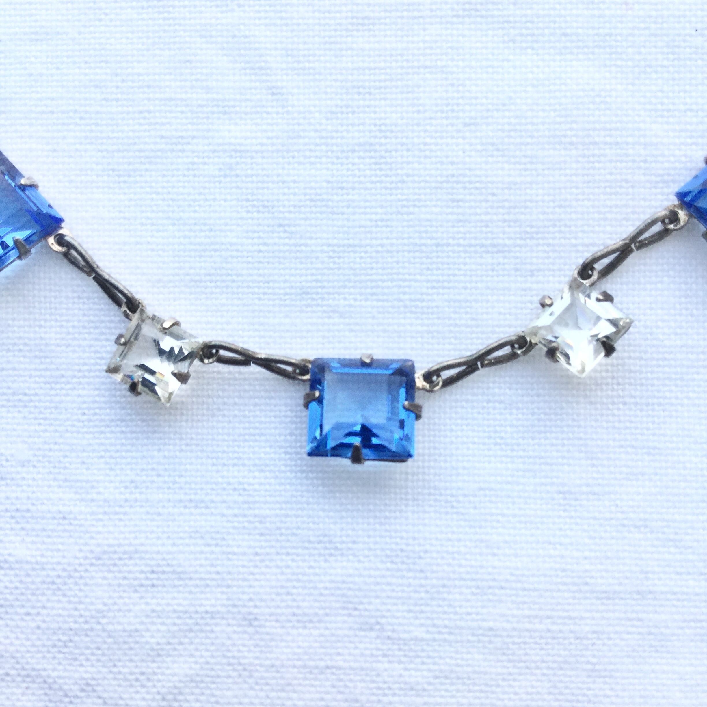 ブルーとクリアのスクエアカットのガラスをオープンバックで配した、アール・デコらしいデザインのネックレス。